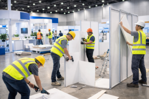 Professional booth construction, installation, and dismantling services executed safely and on schedule according to exhibition guidelines.
